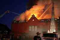 Firefighters expect to remain on the scene until early morning dealing with many mini fires inside the structure, said Larry Gray, spokesman for the Cleveland Fire Department. Firefighters responded at 8:25 p.m. and found the two-story brick historic building fully engulfed in flames. A fire chief on the scene said arson is suspected. Firefighters worked to keep flames jumping and burning the next-door Church of the Nazarene. Smoke could be seen from downtown Cleveland, miles away. The back of the building collapsed about 9 p.m., Gray said. Gray said firefighters do not believe the front of the building will collapse. Firefighters are pouring thousands of gallons on the 103-year-old structure. Masonic leader William Walker of Cleveland, Worshipful Master of Ecclesiastes 120, was called to the scene. "This is a sad day for us," he said. The building has been unused for about five years, he said. But paperwork, paintings, personal information, historic artifacts and furniture were stored in the building. "All that will be lost," Walker said. Related topics: masonic temple fire |