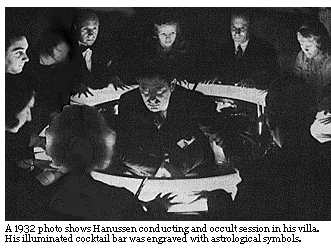 The next day, the Reichstag was in flames and Hitler had all the excuse he needed to go from Chancellor of Germany to Fuhrer of the Third Reich. European history had been changed forever, and once more the Society Seer was right on target. But, six weeks later in April of 11933, Hanussen would be dead: murdered in a forest outside Berlin by agent or agents unknown. There was speculation that Hitler ordered the execution since Hanussenn "knew too much" or perhaps might even have had connections to the Communist Party (hence his accurate prediction of the Reichstag fir; some mediums and psychics - Hannussen was no exception - are known to "enhance" their abilities by gathering intelligence on their clients ahead of time or by bugging the rooms in which seances are held, etc. In fairness, however, no amount of dirty tricks could have explained Hanussen's accurate prediction of Hitler's enormous success in January). Another version had it that Hanussen's murder enraged the Fuhrer, and that he ordered the death sentence for its perpetrators, Karl Ernst, who was executed during the Rohm purge with a bewildered "Heil Hitler" on his lips. Another story, that SA leader Count Wolf Heinrich von Helldorf had Ernst arrest and murder Hanussen because the count owed him money, is also current. Hanussen was said to have thrown orgies at the count's Wannsee villa, where attractive young ladies - usually "actresses" - were thrown into hypnotic trances and made to mime orgasms. The count was a rather degenerate sort who went through money like schnapps, and wound up owing a great deal to Hanussen, who carried the count's markers with him whereever he went. Needless to say, the markers were never found (which either proves that the count killed Hanussen and removed the IOU's from the body, or that the story is completely fictitious and never happened; take your pick).